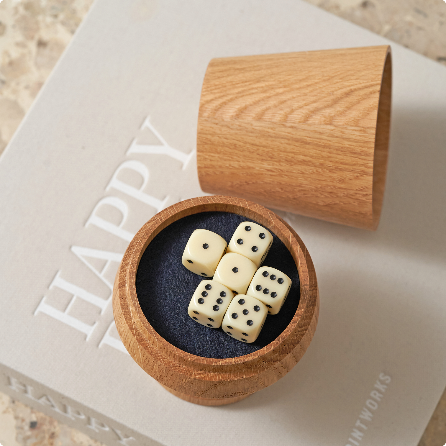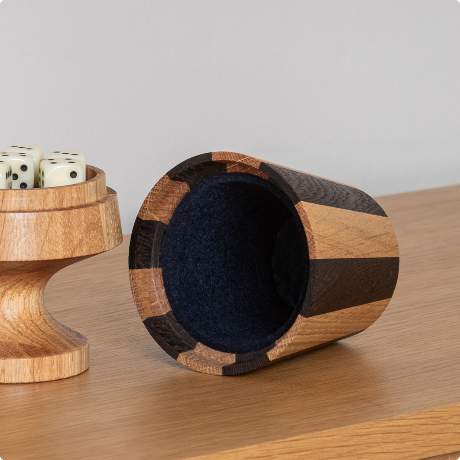 Raflebægeret giver et særdeles afdæmpet og kontrolleret terningekast og har en distinkt form, der ligger perfekt i hånden. Det er udstyret med indvendig filt, der absorberer støjen, og et bundstykke, der holder terningerne, så de ikke falder på gulvet.